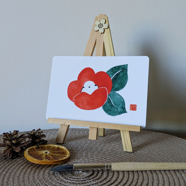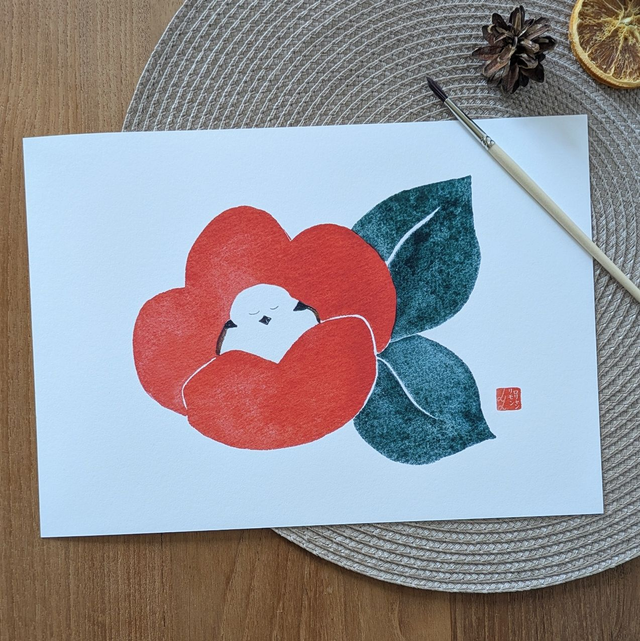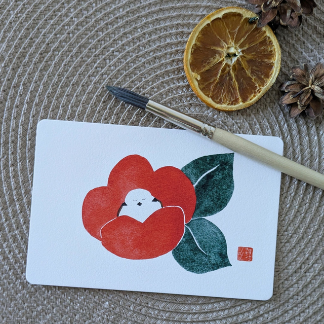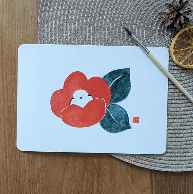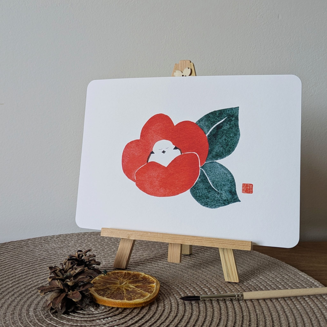 C'est hiver ! Un petit Shima enaga fait une pause au coeur d'une fleur de camélia rouge <3