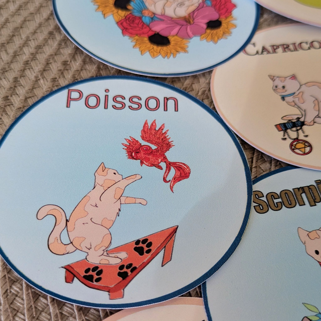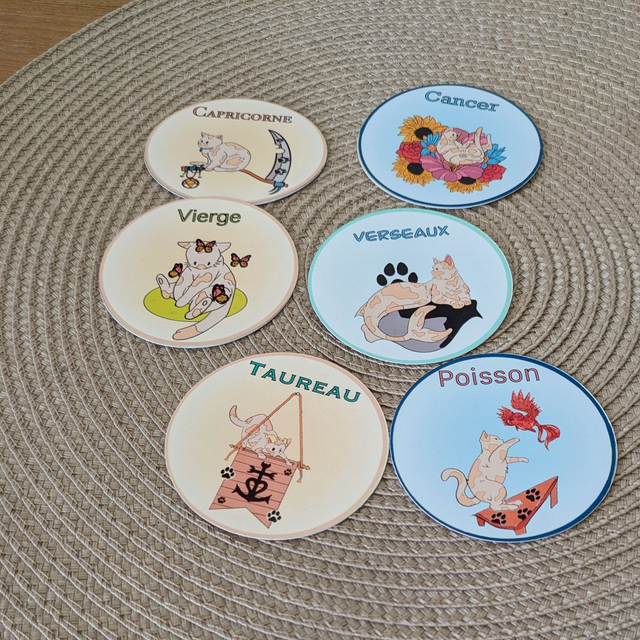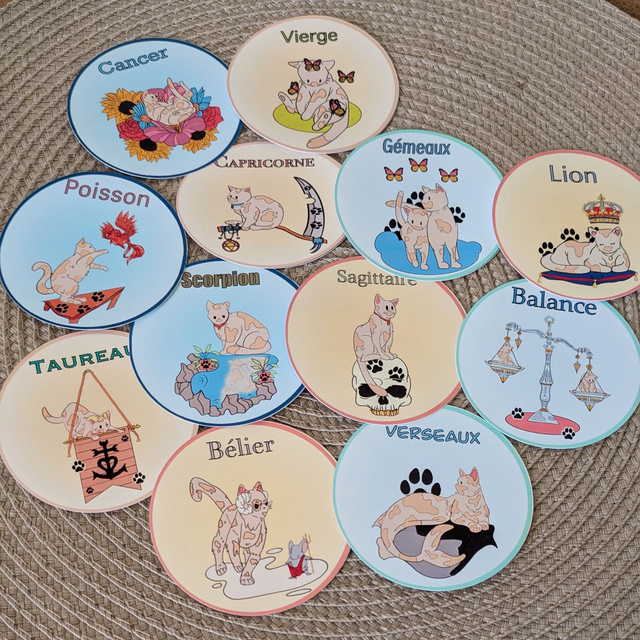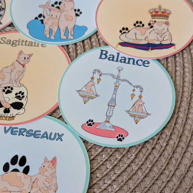 12 stickers représentant les 12 signes astrologiques occidentaux mettant en scène un chat tacheté.
