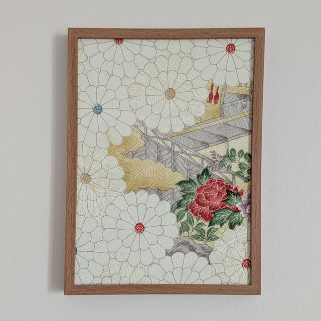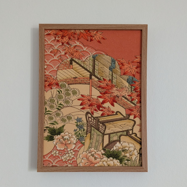 Composée de 3 cadres distincts, en pvc imitation bois, cette création UNIQUE renferme 3 tissu de kimono japonais vintage mettant à l'honneur