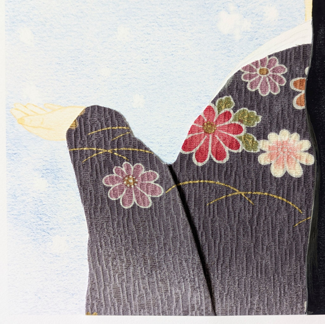 Alliant l’aquarelle et l’usage de chutes de kimono de seconde main, ceci est une œuvre semi-originale.