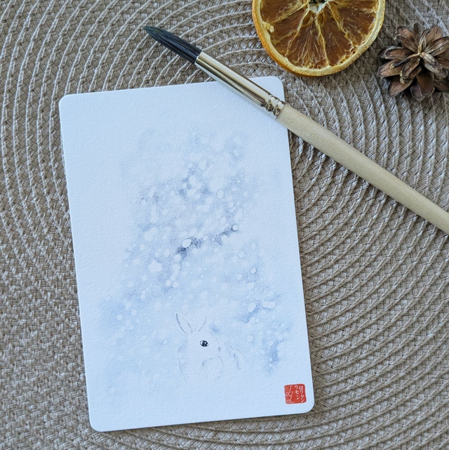 Dans un blizzard gris bleu, un petit lapin des neiges affronte le froid. Courage petit lapin !